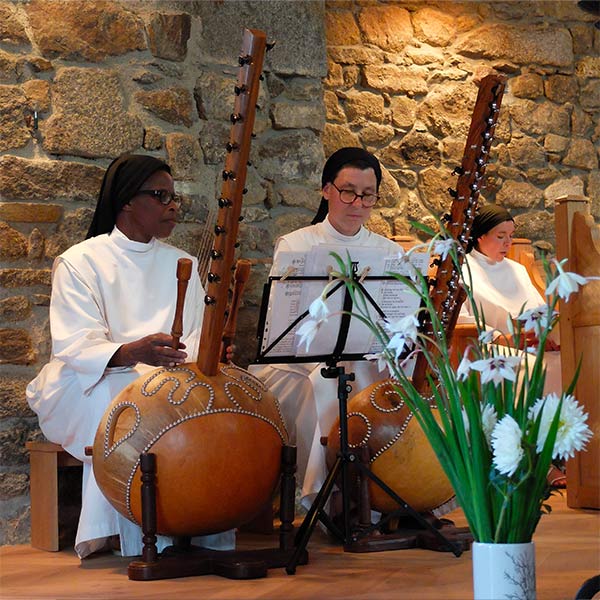 La kora, harpe africaine, accompagne notre liturgie, rythmée parfois aussi par d’autres instruments.